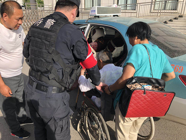 5月27日8时19分,巡特警支队猎鹰连山大队北站中队民警刘镓著带领辅警朱子涵、邵旭在北站广场步巡时,发现从一辆出租车下来4名年迈的老人,其中1名老人下肢瘫痪无法行走,其他3名老人搀扶他非常吃力。